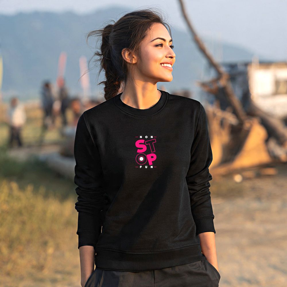 Non Stop Fun Women’s Back Print Sweatshirt For Winter Black French Terry Cotton